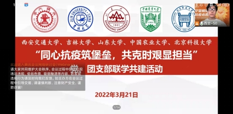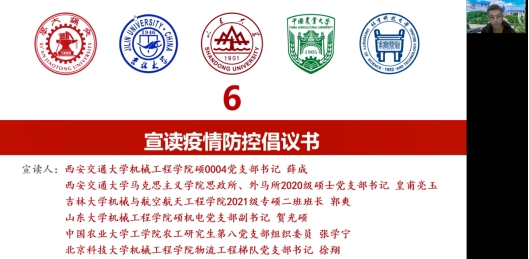 近期,国内点状散发疫情在多地出现,校园疫情防控形势严峻复杂。面对新一轮疫情的再次反弹,为贯彻落实习近平总书记关于疫情防控的讲话精神,充分发挥党支部和党员在疫情防控工作中的战斗堡垒作用和先锋模范作用。3月21日下午,yl23455永利官网硕机电党支部、2020级学硕1班团支部等基层组织联合西安交通大学、吉林大学、中国农业大学、北京科技大学等五校研究生党支部、团支部成功举办第二次联学共建暨让党旗在疫情防控一线高高飘扬云端学习交流活动,活动主题为“同心抗疫筑堡垒,共克时艰显担当”。yl23455永利官网党委副书记滕玉军、西安交通大学yl23455永利官网党委副书记张敏、中国农业大学工学院党委副书记陈度以及四地相关高校辅导员、党员、团支部书记参加活动,活动参与人超过500。