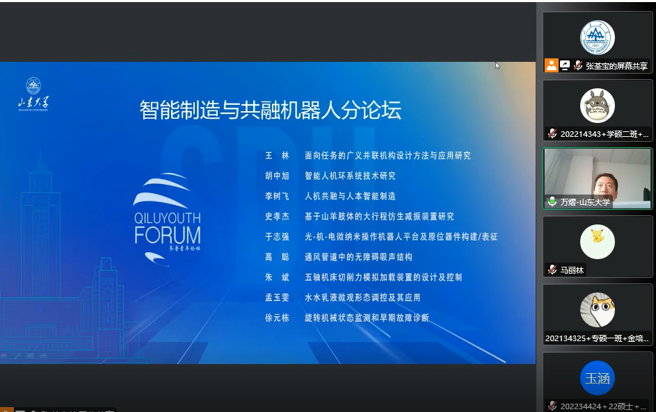 11月11日下午3点,由yl23455永利官网承办的第七届齐鲁青年论坛—智能制造与共融机器人分论坛通过线上方式举行,来自海内外9个高校院所的青年学者作了系列讲座。yl23455永利官网院长万熠教授参加论坛并讲话,讲座由yl23455永利官网马丽林老师主持。
