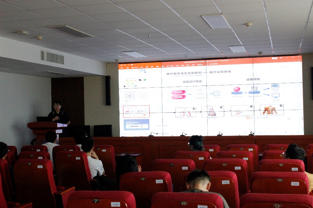 马嵩华副研究员首先介绍了研究背景,随着科技的进步,智能制造是当今制造业发展的方向,而数字孪生和其他新技术如机器学习、物联网传输一样,为当今智能制造的发展提供了巨大的可能性。紧接着,马嵩华副研究员向大家介绍了当今数字孪生如何在制造业中发挥其作用,并介绍了相关案例。在医疗设备研发中需要先设置人体数字孪生模型,在设置设备测试试验平台,最后准备医疗设备样机和医疗设备虚拟样机,两者相互对照,通过模拟设备的运行情况,可以提前发现设备潜在的隐患,从而提高设备的可靠性和运行效率。讲座结束后,同学们踊跃发言,针对自己的感兴趣内容与疑惑,和老师进行了交流,马嵩华副研究员对同学们的问题进行了详细解答。