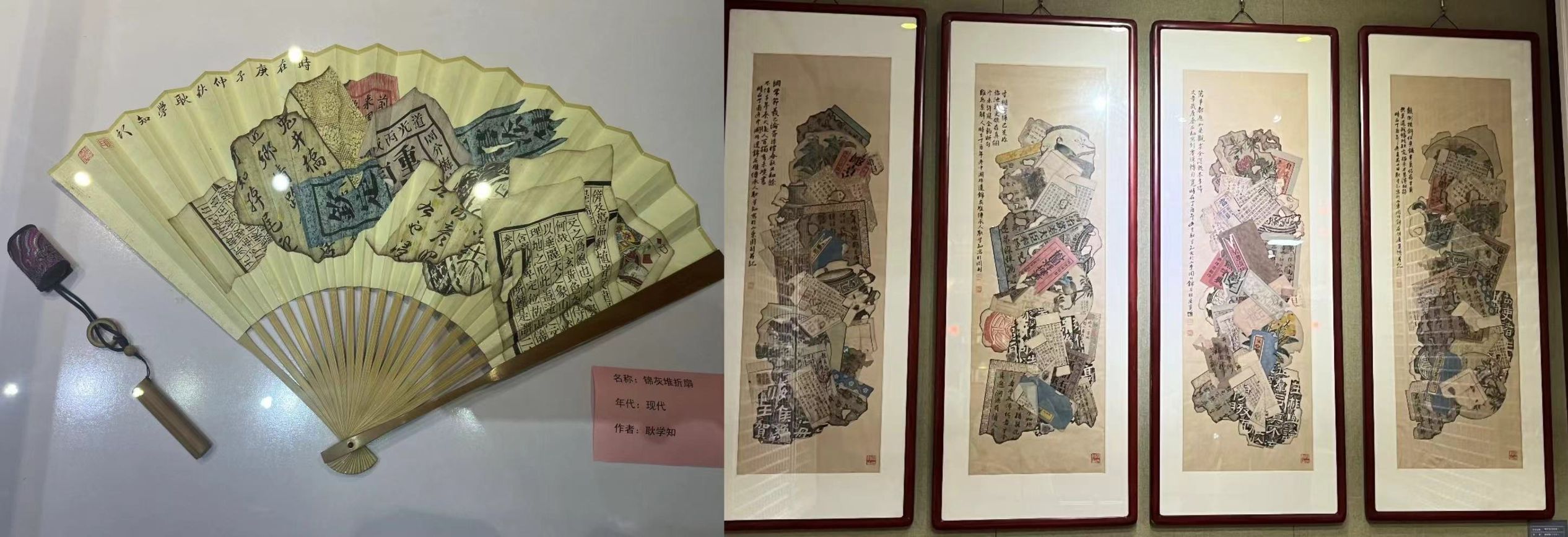 本次展览共展出周村锦灰堆展览馆馆藏作品共计60余件套,包含锦灰堆瓷器作品、临摹清代、民国锦灰堆画作以及历代锦灰堆传承人作品等。锦灰堆作为中国画的一种特殊画法,通过破碎、翻卷、撕裂、烟熏等创作手法,作品展现一种古朴典雅、耐人寻味之感,被誉为“非书胜于书、非画胜于画”,将艺术、创作、历史价值融于一体,具有较高的艺术价值。